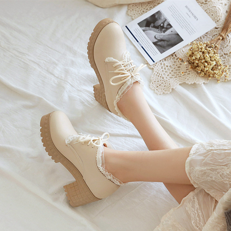 2025春新款甜美蕾丝系带公主鞋厚底粗跟女鞋子防水台大码高跟单鞋