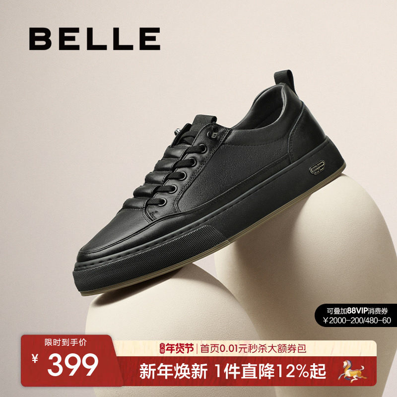 百丽男士厚底小白鞋男冬季加绒真皮黑色休闲跑步运动板鞋A1230CM3