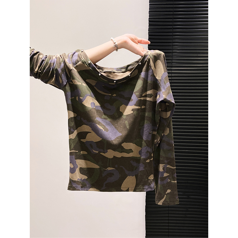 小众独特辣妹一字领长袖t恤女秋装新款宽松显瘦铆钉迷彩露肩上衣