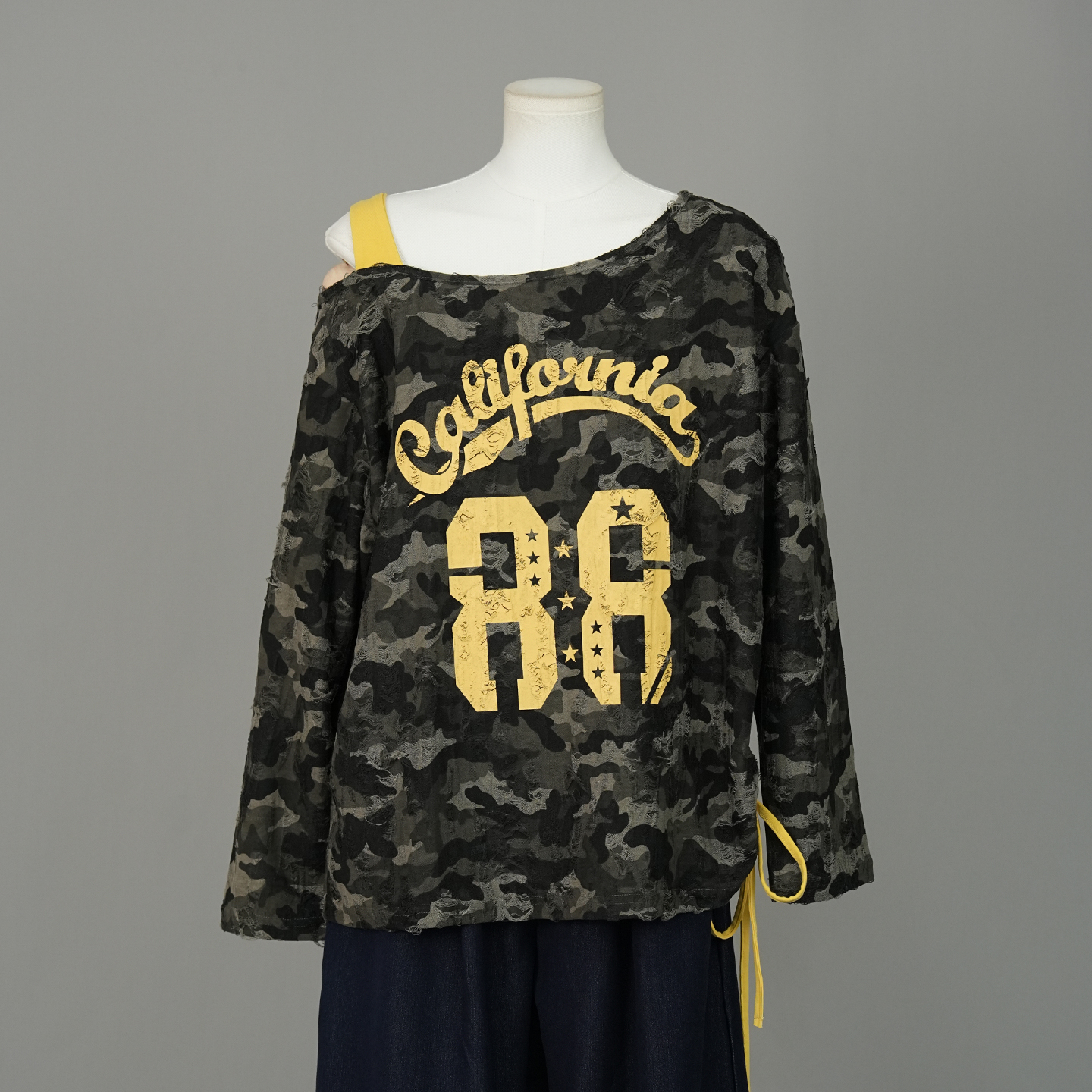 KFCAG 美式辣妹破坏感迷彩斜肩设计感长袖t恤女早秋露肩显瘦上衣