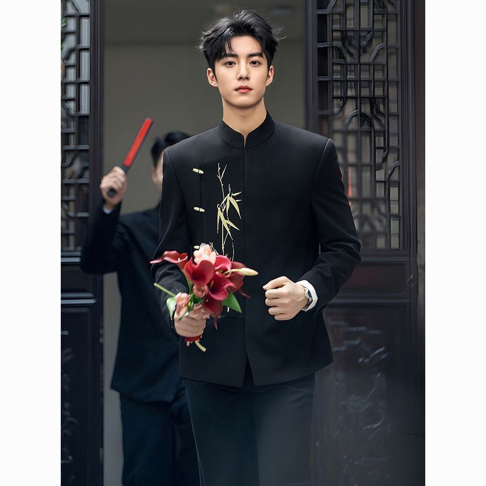 高级感中国风刺绣立领唐中山装男新郎结婚西服套装新中式主持复古
