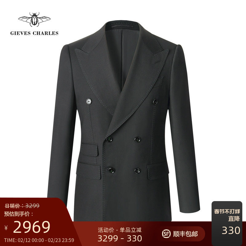 GIEVES CHARLES绿色明线包边男士双排扣商务时尚宴会结婚西服套装