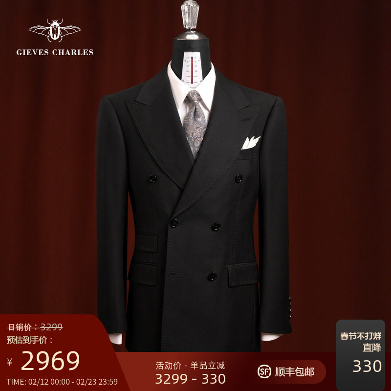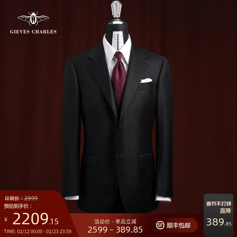 【130支纯羊毛】黑色半麻衬手工西服套装男士商务结婚西服套装男