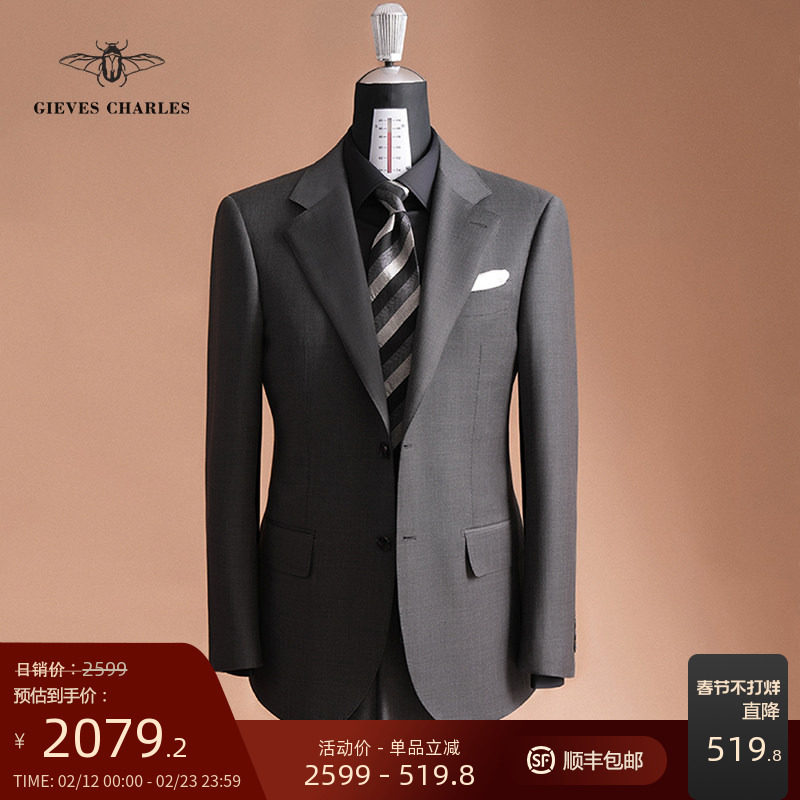 【130支纯羊毛】深灰色半麻衬手工西服套装男士商务结婚西服套装