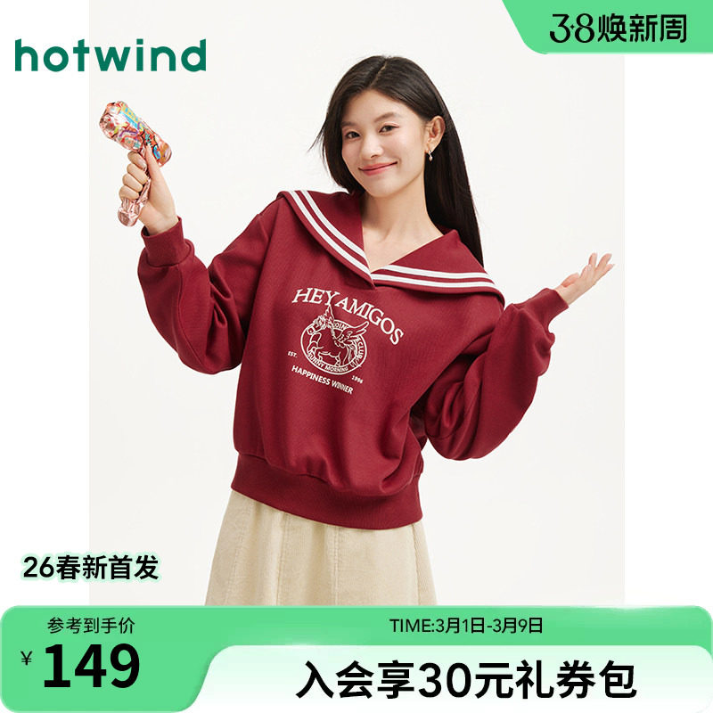 热风女士卫衣连帽套头2026年春季新款撞色字母印花休闲卫衣内搭