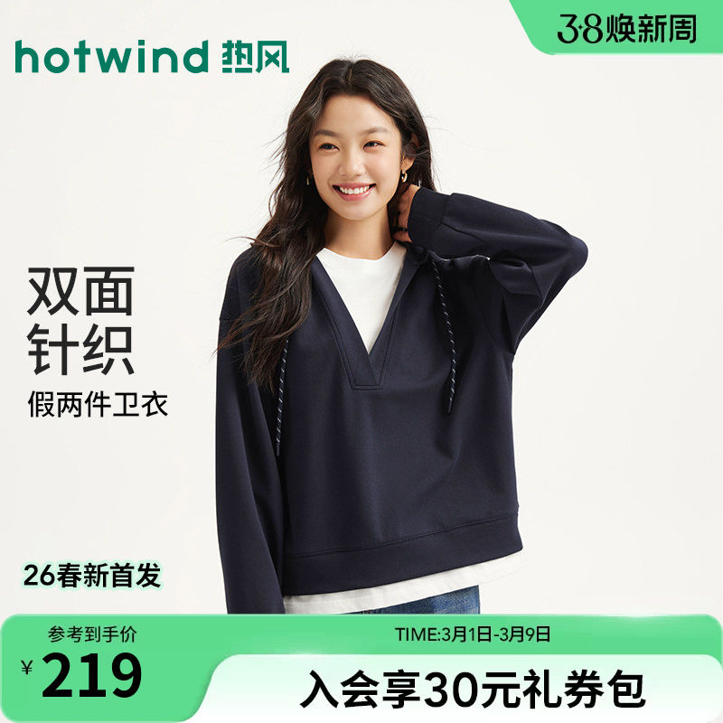 热风女士假两件连帽宽松卫衣2026年春季新款V领显瘦韩系宽松卫衣