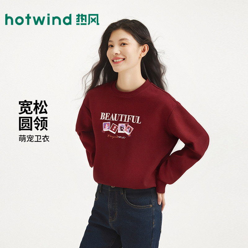 热风女士红色卫衣2026年春季新款新年萌宠插画圆领宽松内搭卫衣