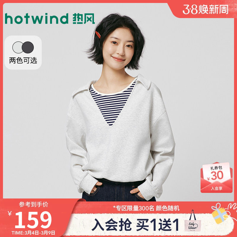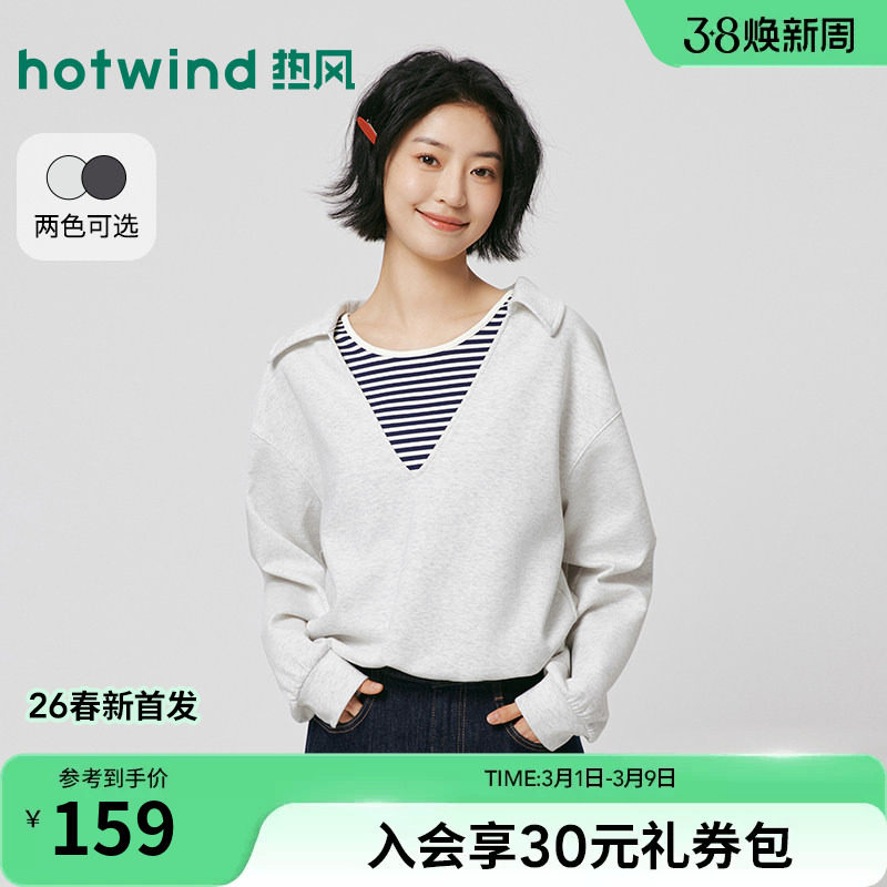 热风女士卫衣韩系假两件翻领卫衣2026年春季新款宽松条纹内搭上衣