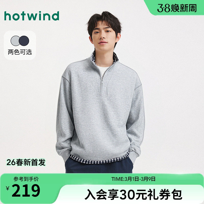 热风男士卫衣2026年春季新款立领格子拼色卫衣半拉连韩系内搭卫衣