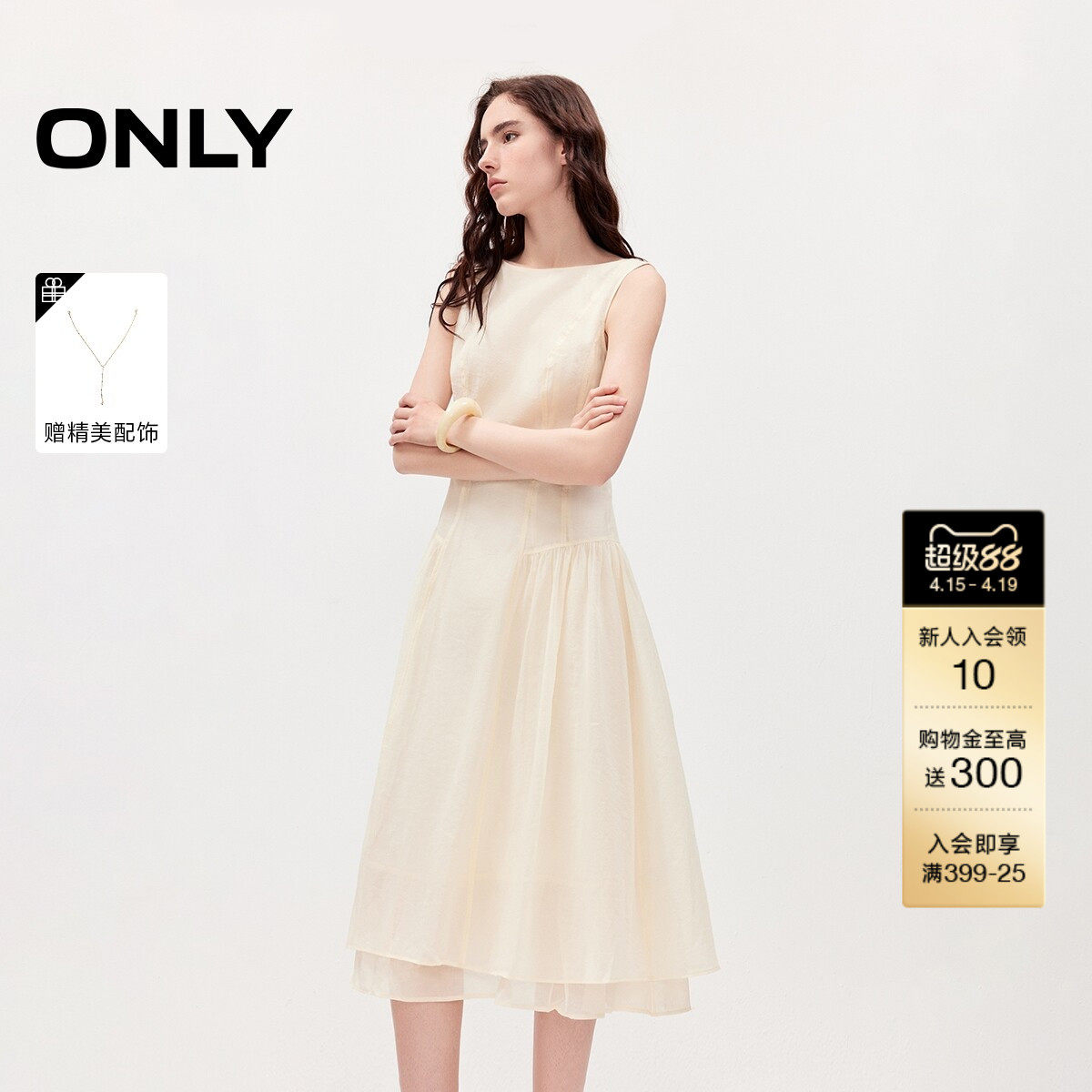 ONLY2026春季新款松弛感U领无袖裙子拼接腰间抽褶长裙连衣裙女