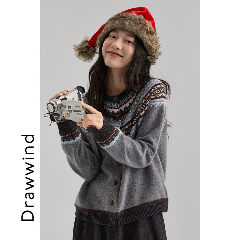画风drawwind冬季费尔岛提花圆领开衫女复古羊毛毛衣外套2025新款