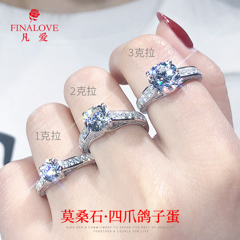 正品D色莫桑石钻戒1克拉纯银求婚结婚戒指女经典四爪款婚戒送女友