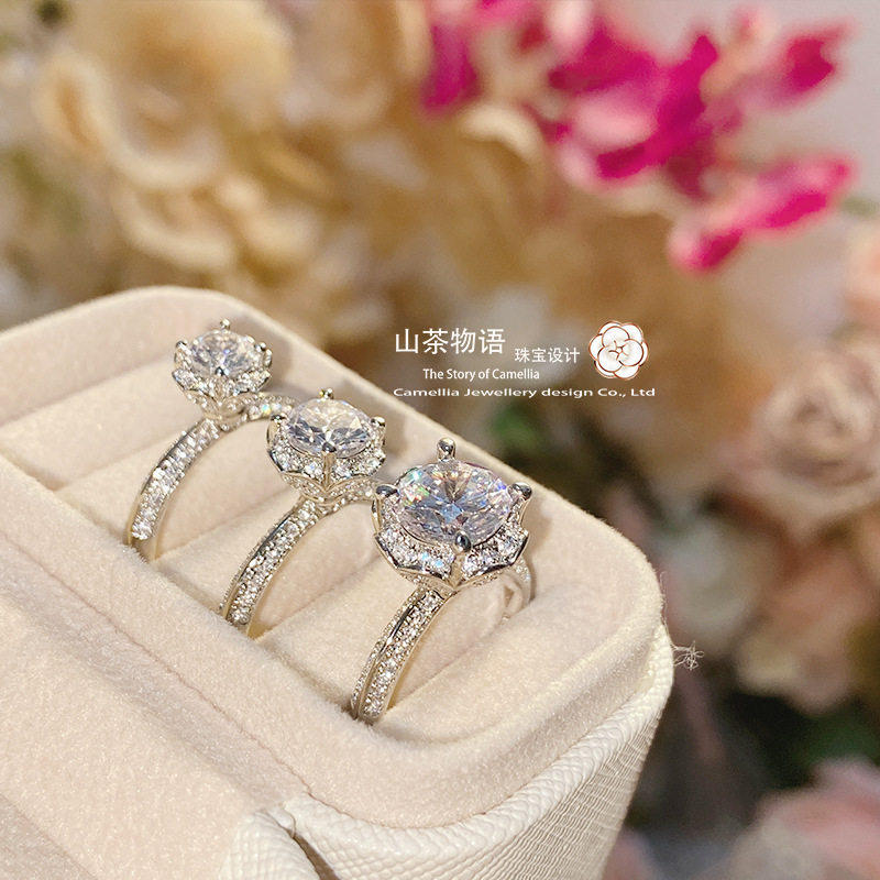 S925纯银爆闪椭圆形锆石戒指女款莫桑石四爪仿真婚戒小众设计礼物