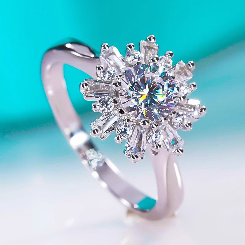 PT950铂金美国进口D色莫桑石群镶满钻雏菊戒指纯银四爪雪花钻戒