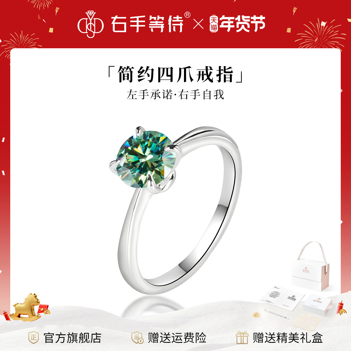 右手等待简约四爪莫桑钻戒指极光绿S925纯银莫桑石经典闭口钻戒女