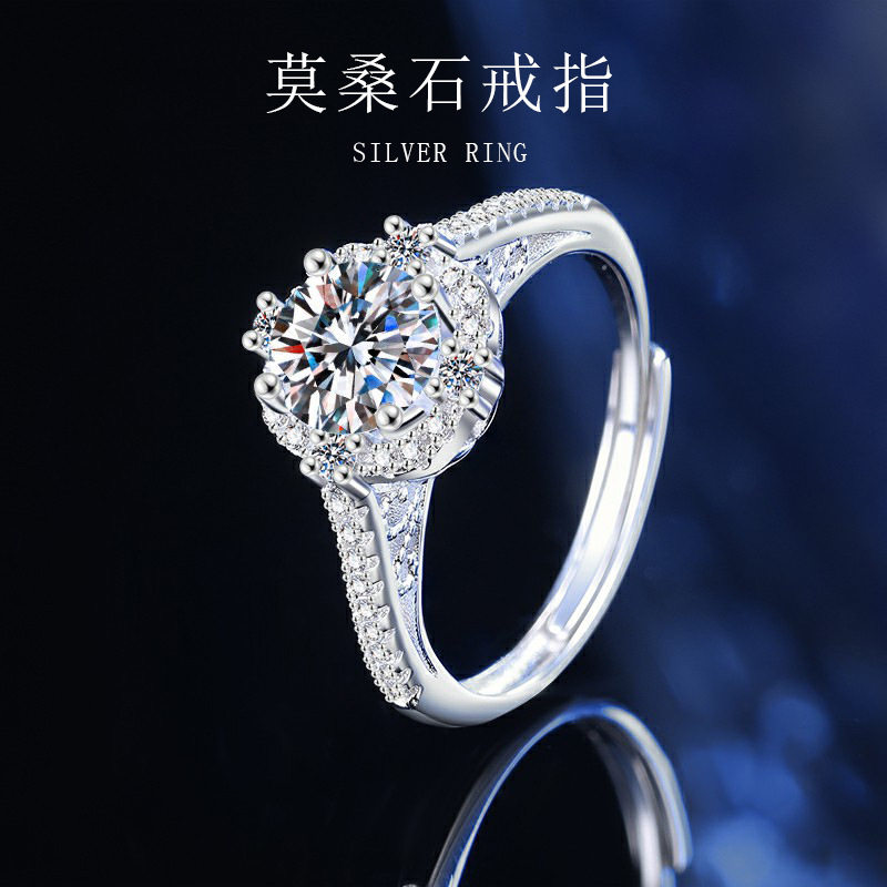 s925纯银正品莫桑石戒指女经典四爪一克拉女戒活口女几何指环直播