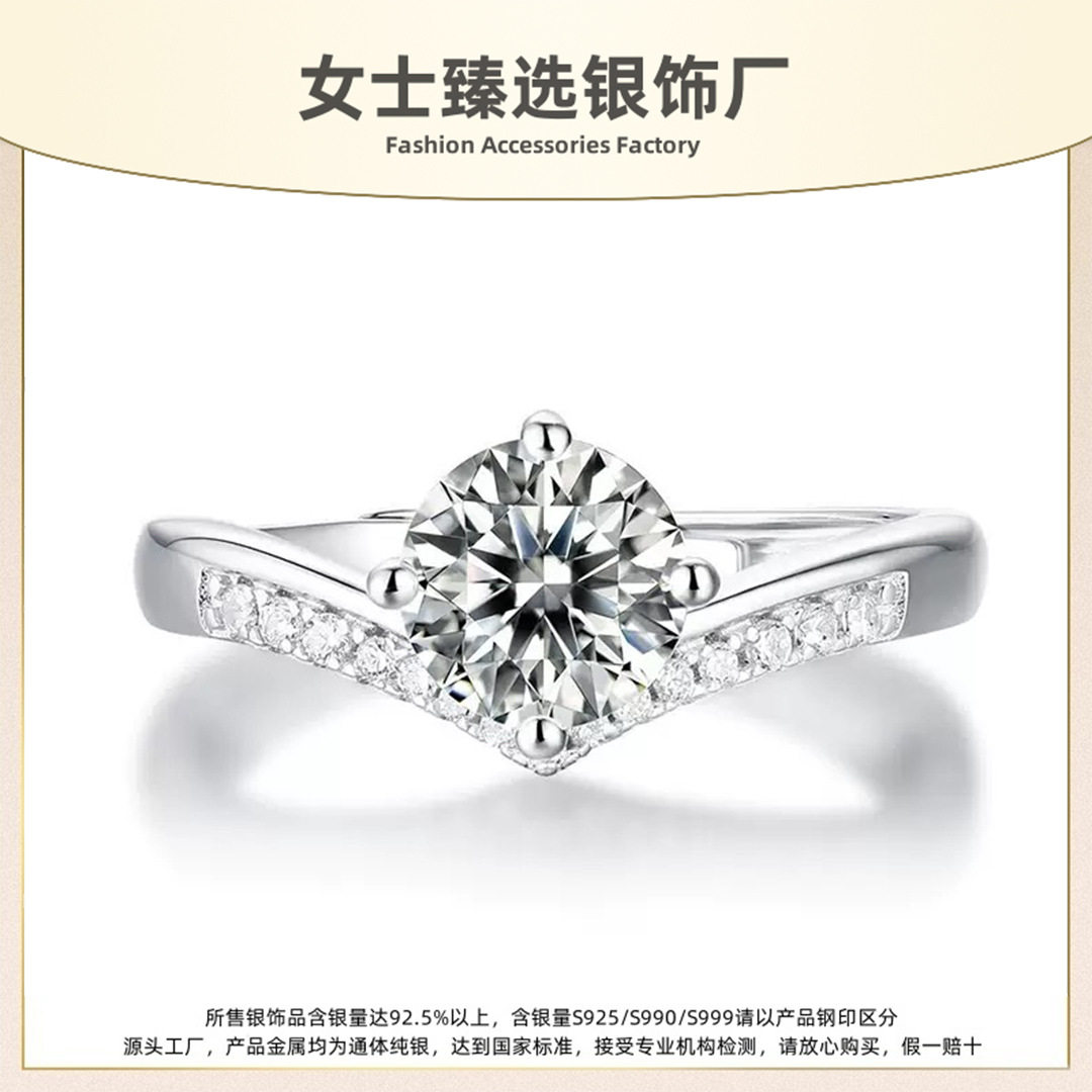 进口D色莫桑石钻戒s925纯银镶嵌求婚戒指女婚戒V型四爪皇冠款饰品