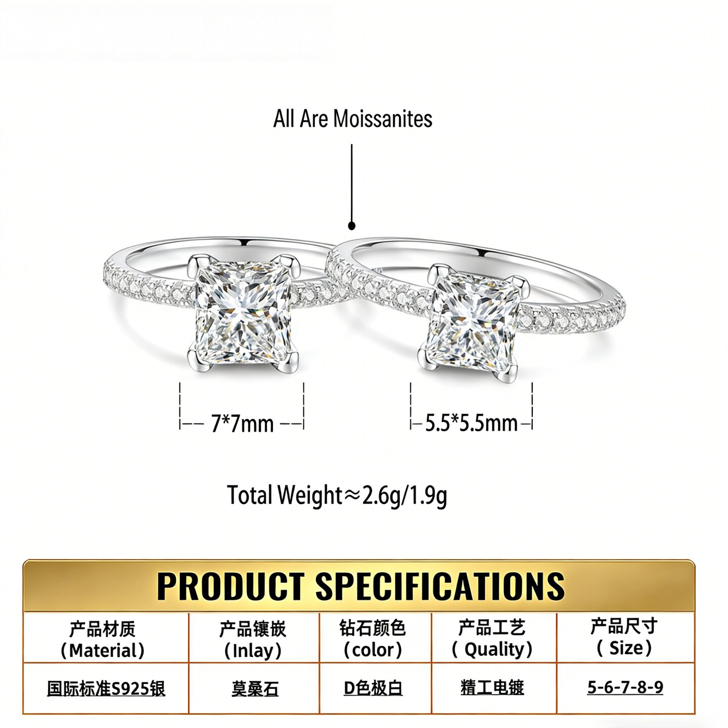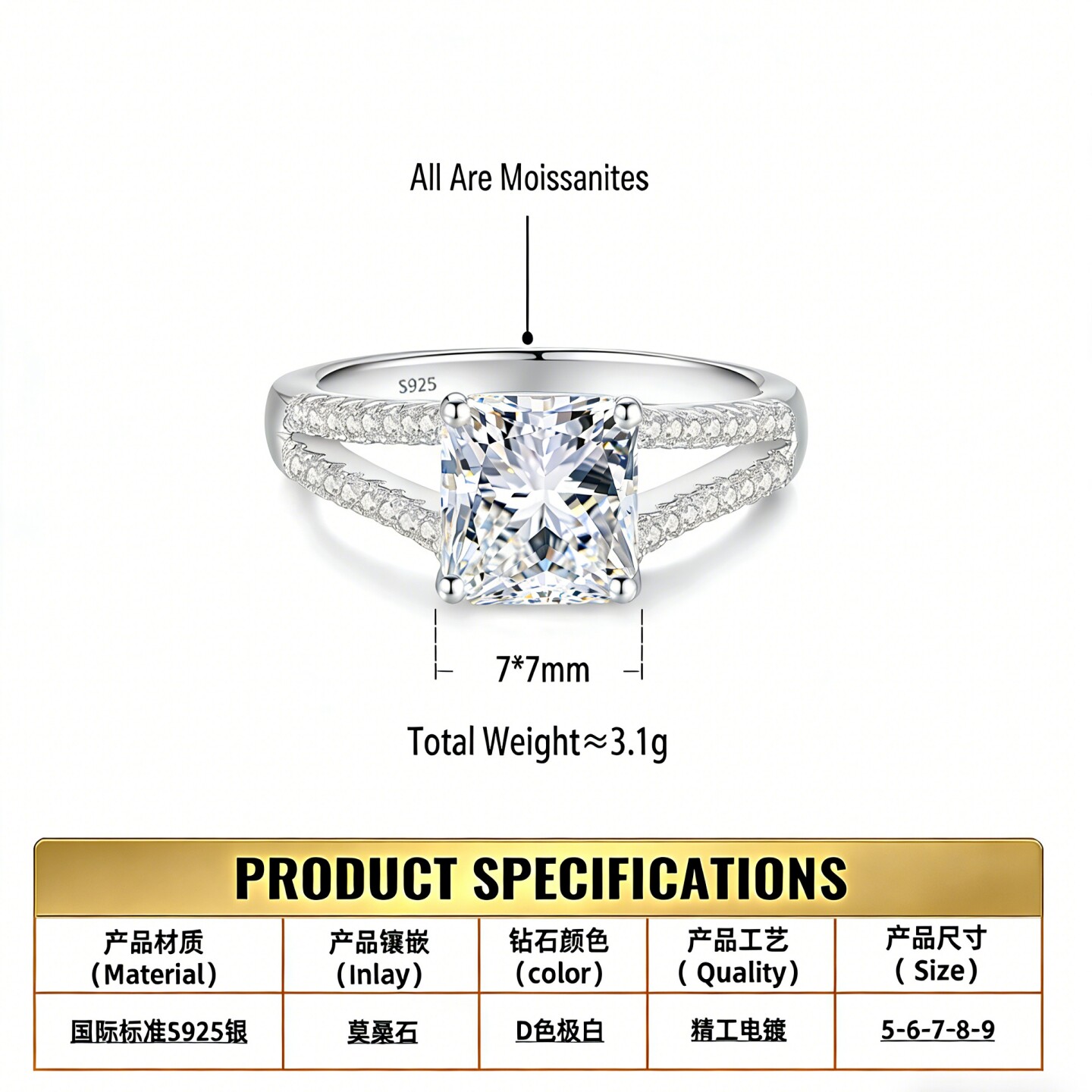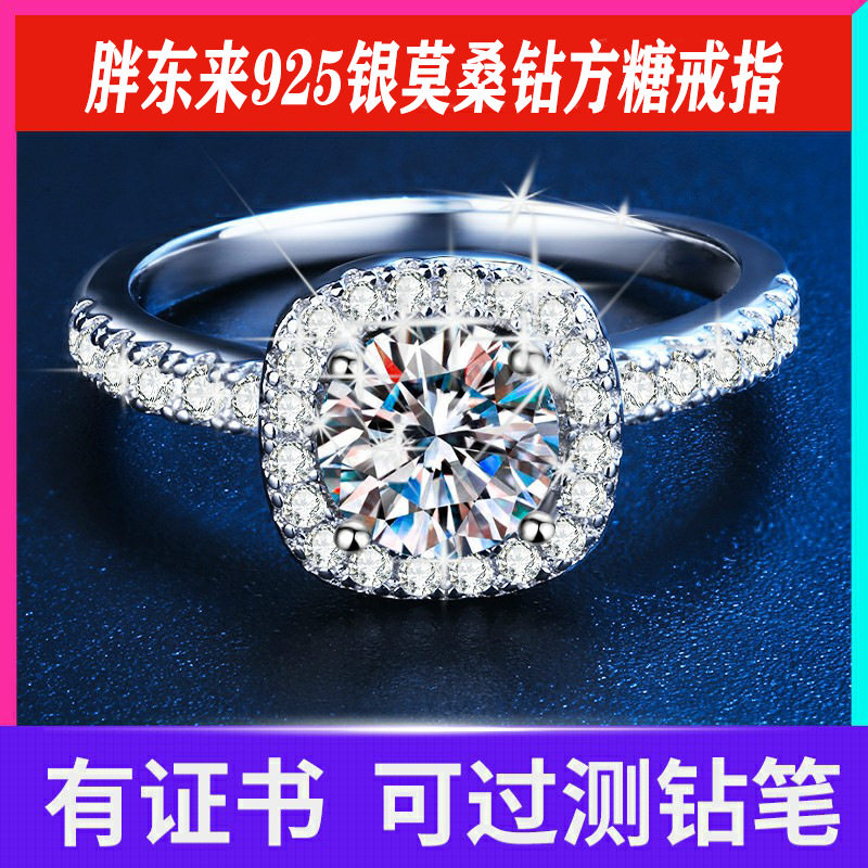 s925纯银镀pt950金女1克拉戒指四爪豪华小方糖方包莫桑石戒指跨境