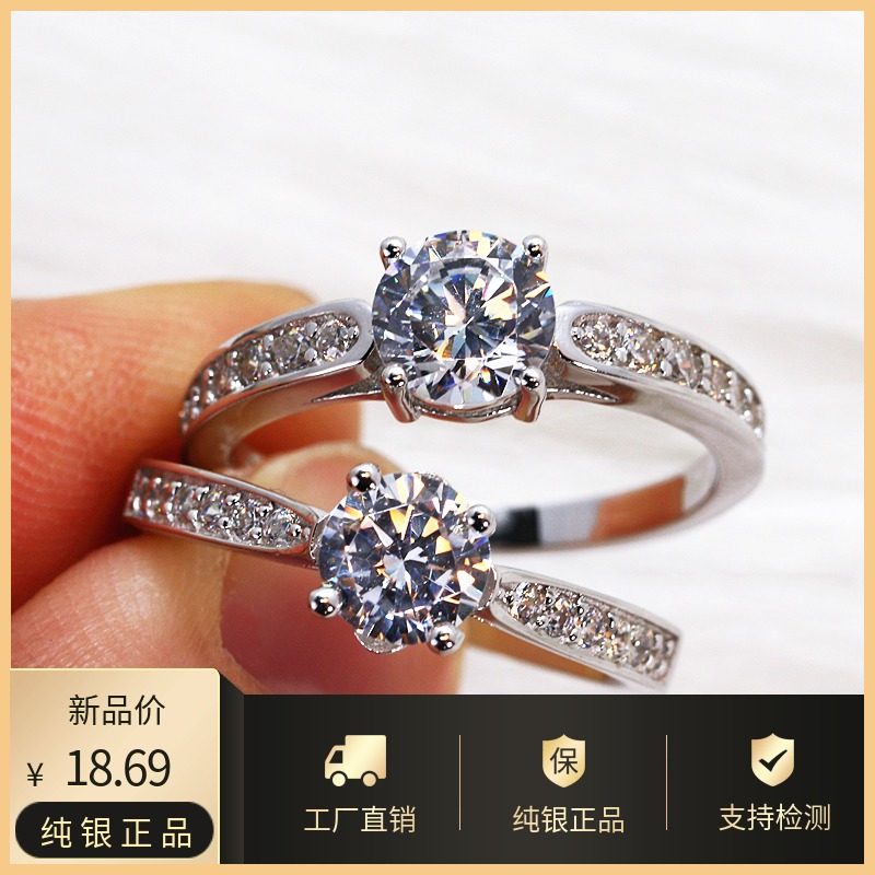 S925纯银四爪女款莫桑仿真钻石戒食指结婚戒微镶锆石戒指气质银饰