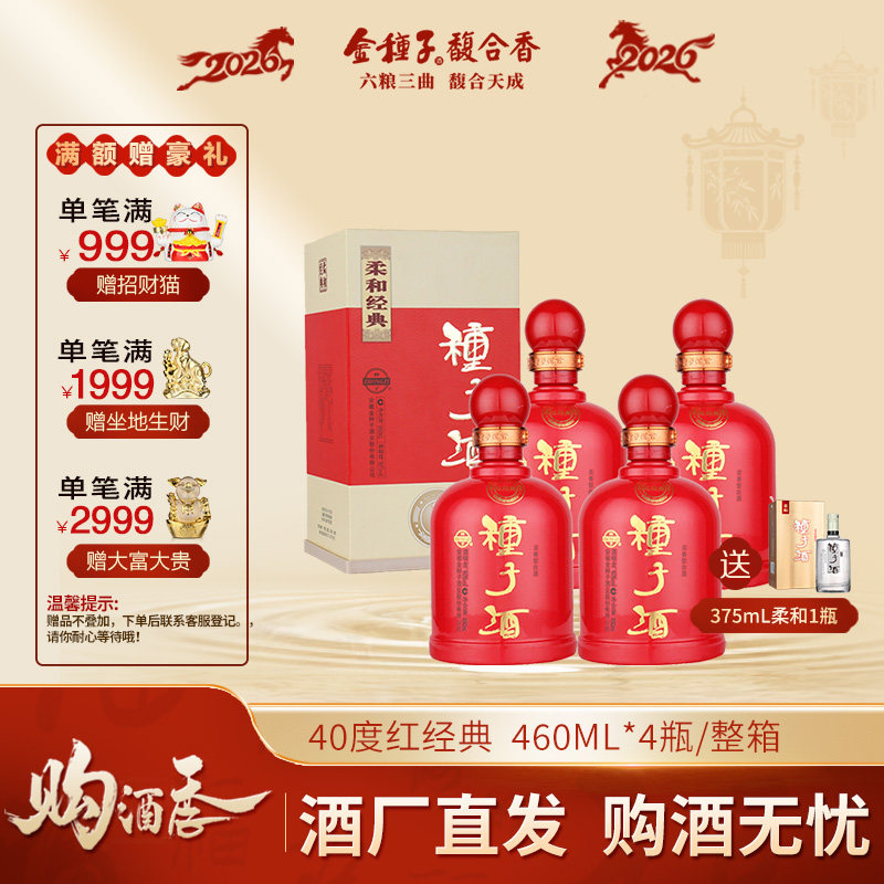 金种子酒柔和红经典浓香型白酒40度460ml*4瓶整箱礼盒纯粮食自饮