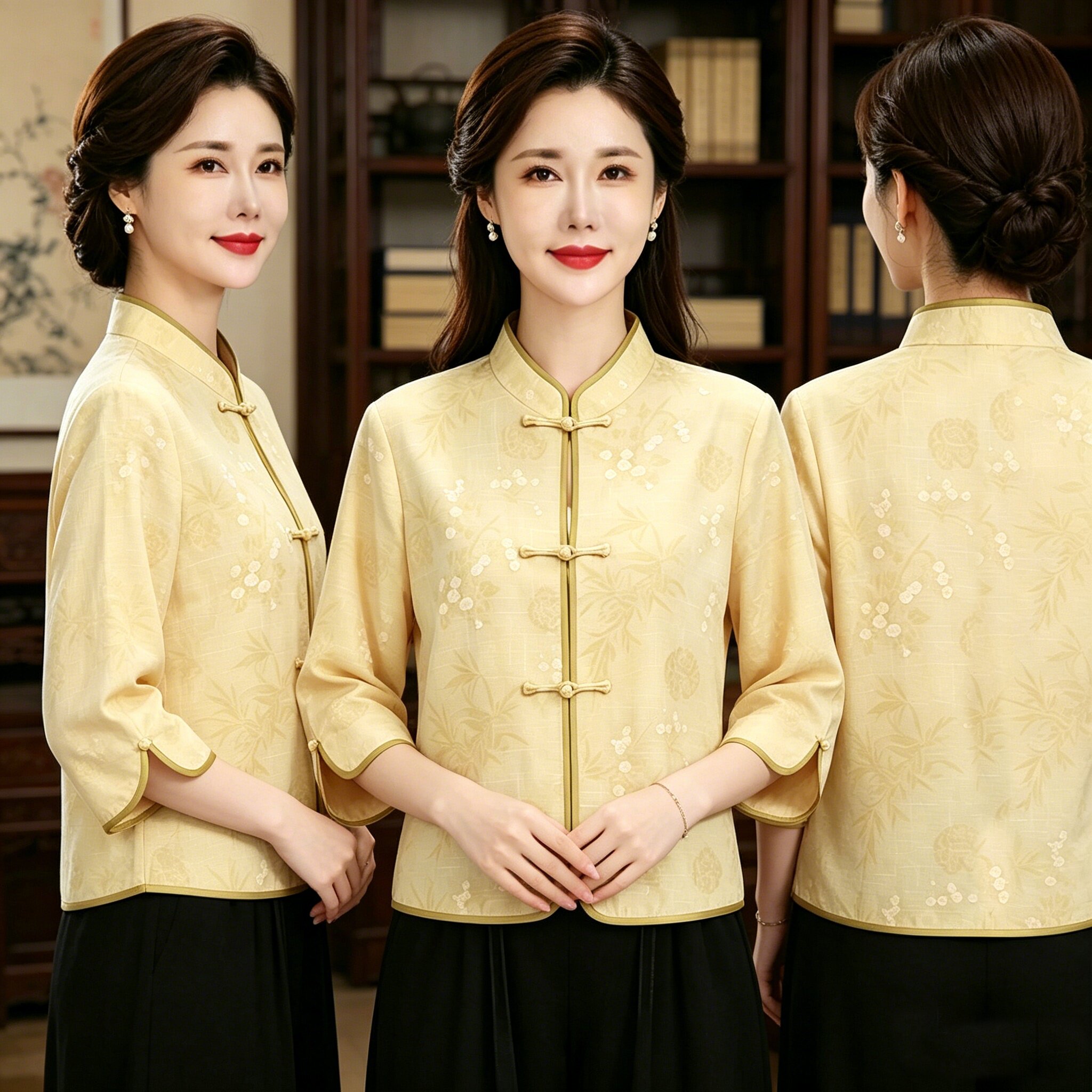 中年妈妈夏季七分袖改良旗袍上衣汉服中老年女春装新中式国风唐装