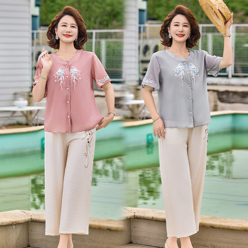 中年妈妈夏装雪纺套装2026新款民族风刺绣衬衫中老年人老太太唐装