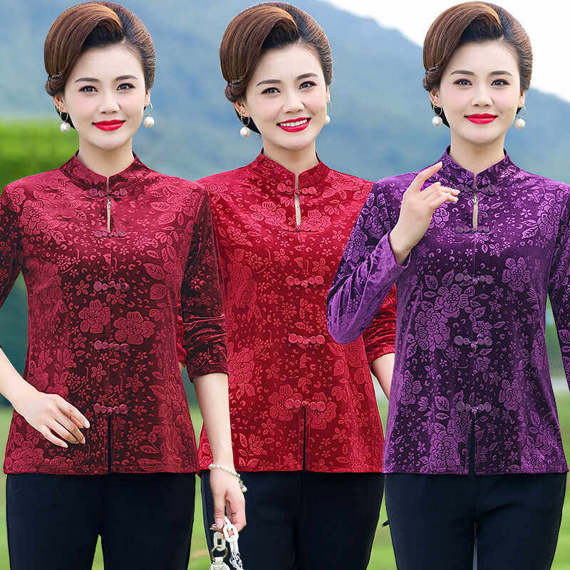 妈妈秋装金丝绒唐装旗袍上衣中年女洋气打底小衫提花百搭春秋t恤