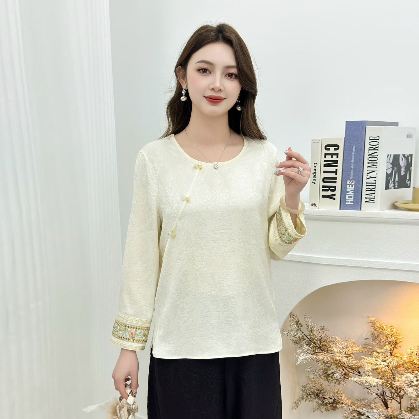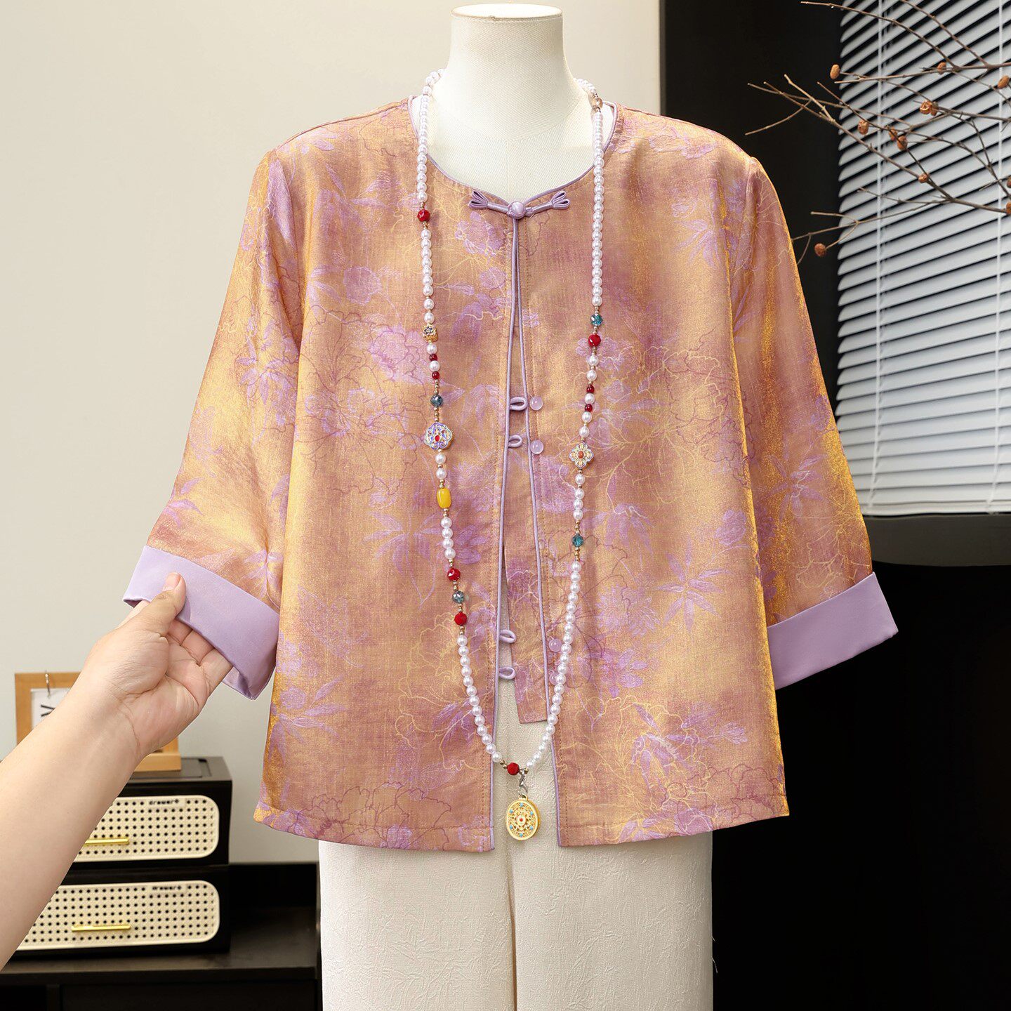 2026春夏新款外套国风唐装上衣中年妈妈提花缎盘扣开衫减龄薄衬衫