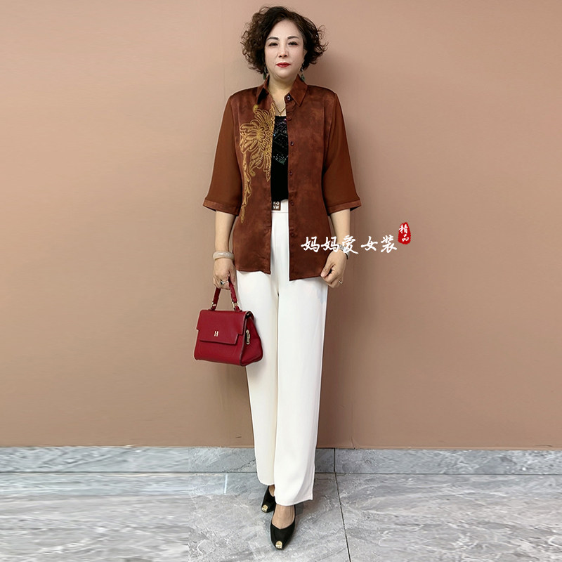 中年妈妈春季新中式国风印花衬衫套装中老年女唐装宽松洋气上衣裤