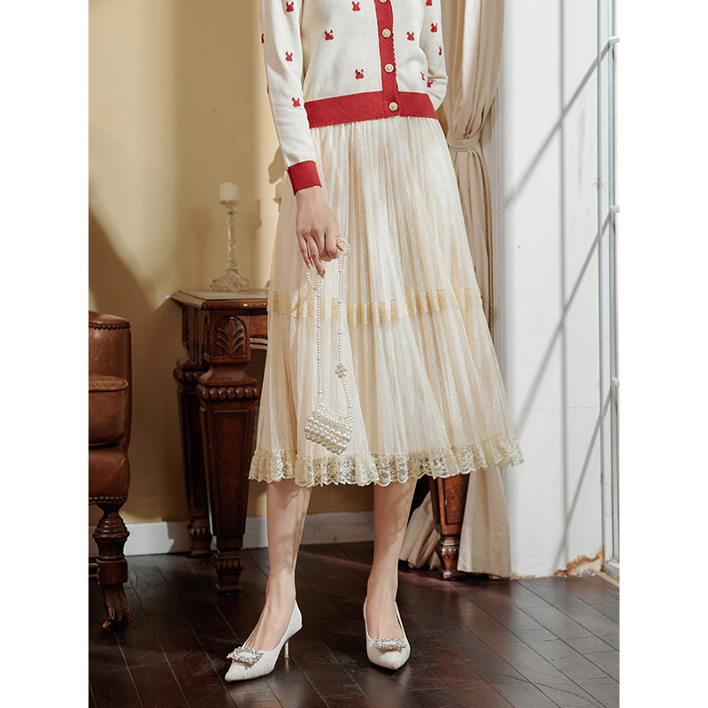固执春季新款松紧腰蕾丝网纱中长半身裙80131BQ07980