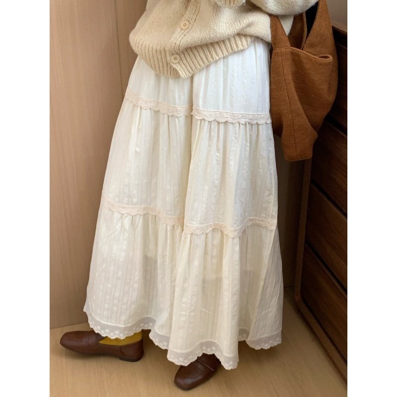 pusumede蕾丝花边松紧腰半身裙女A字蛋糕裙气质长裙莱赛尔白色裙