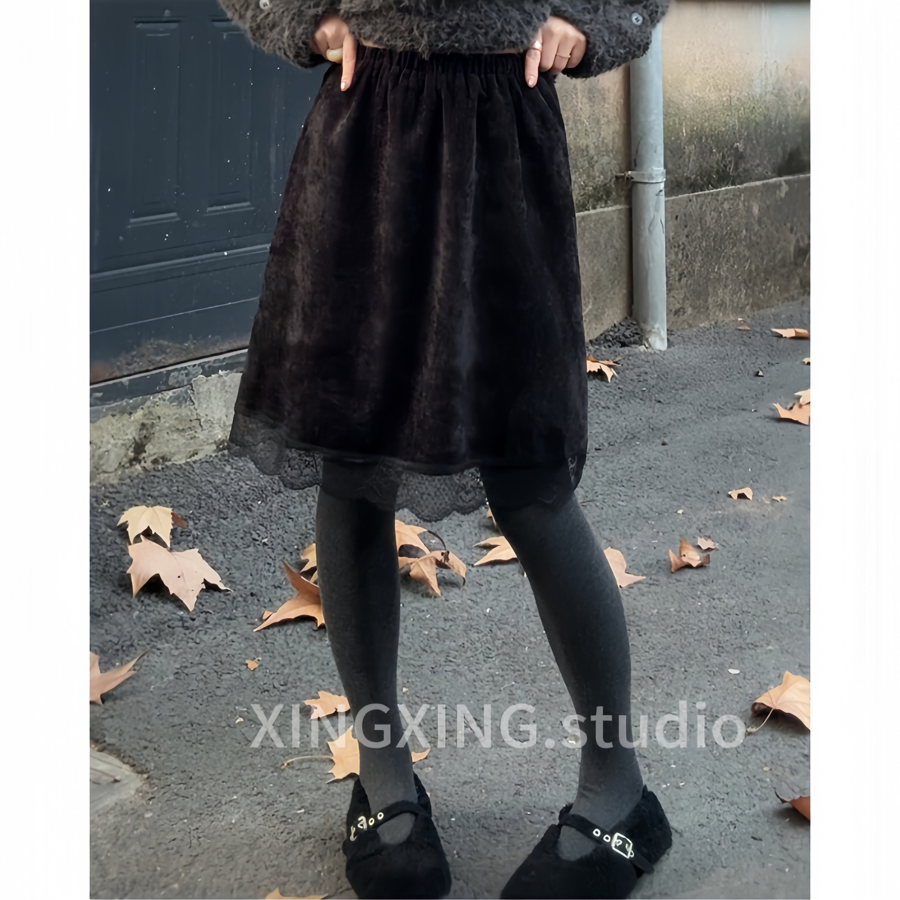 X.x.韩版蕾丝拼接松紧腰半身裙女冬季新款气质显瘦减龄半裙50352