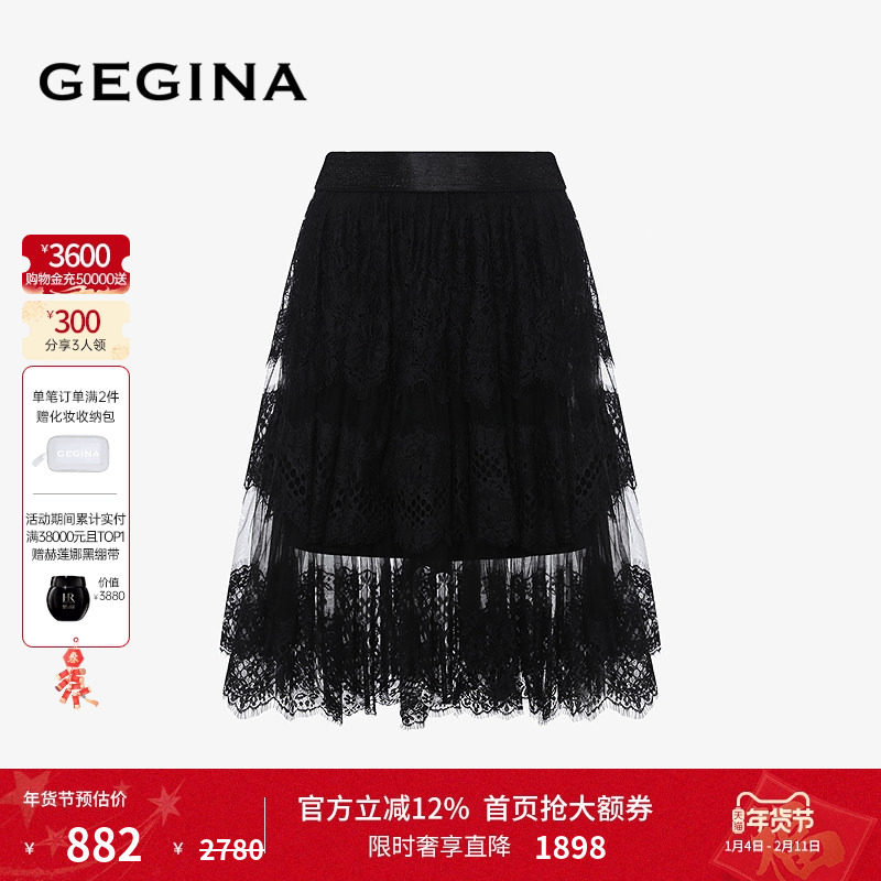 GEGINA吉吉娜春夏季新品蕾丝拼接黑色半身裙松紧腰显瘦气质裙子女