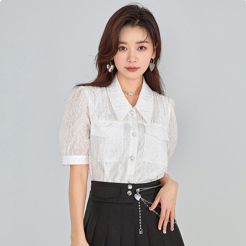 时尚简约花纹盐缩V领泡泡袖衬衫2022夏季新款纯色通勤上衣女