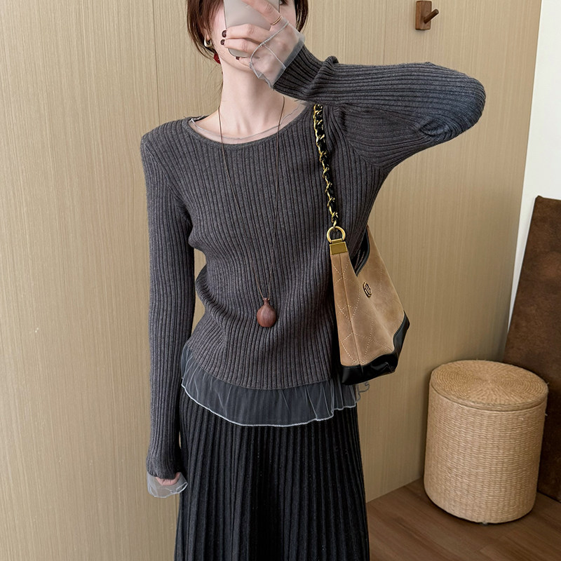 针织蕾丝修身女装假两件打底衫2025秋冬新款韩版休闲甜美气质上衣