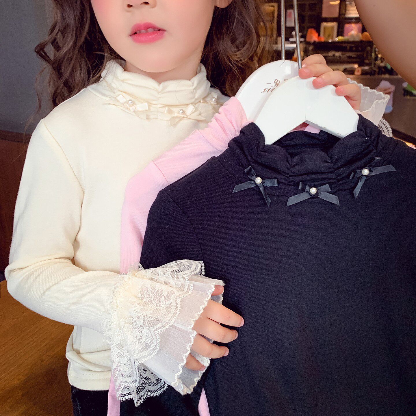 女童加绒打底衫冬装2025新款韩版加厚儿童冬季蕾丝半高领花边上衣
