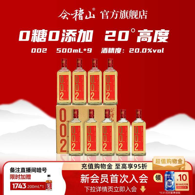 会稽山官方绍兴黄酒002高度黄酒500ml*9瓶装0添加高度陈酿黄酒