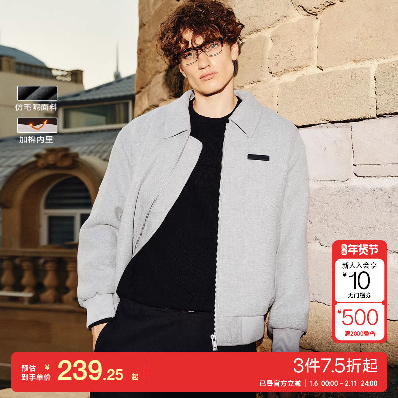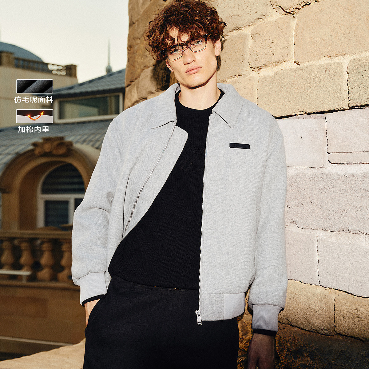 绫致杰克琼斯冬季棉服外套男仿毛呢保暖行政夹克静奢风宽松棉衣男