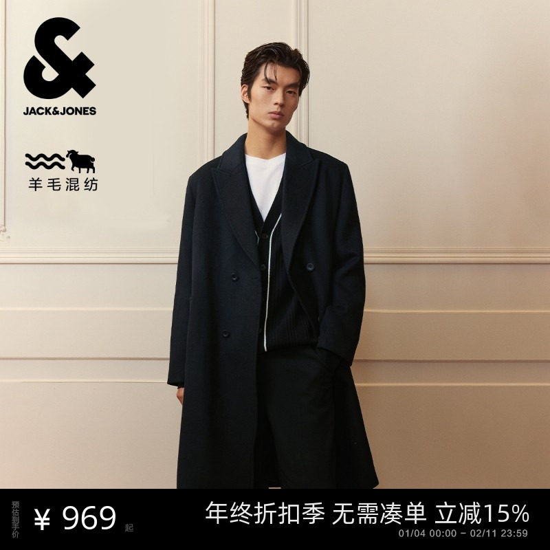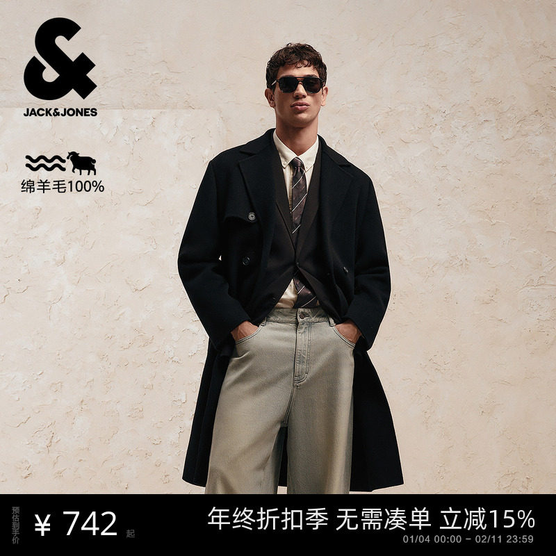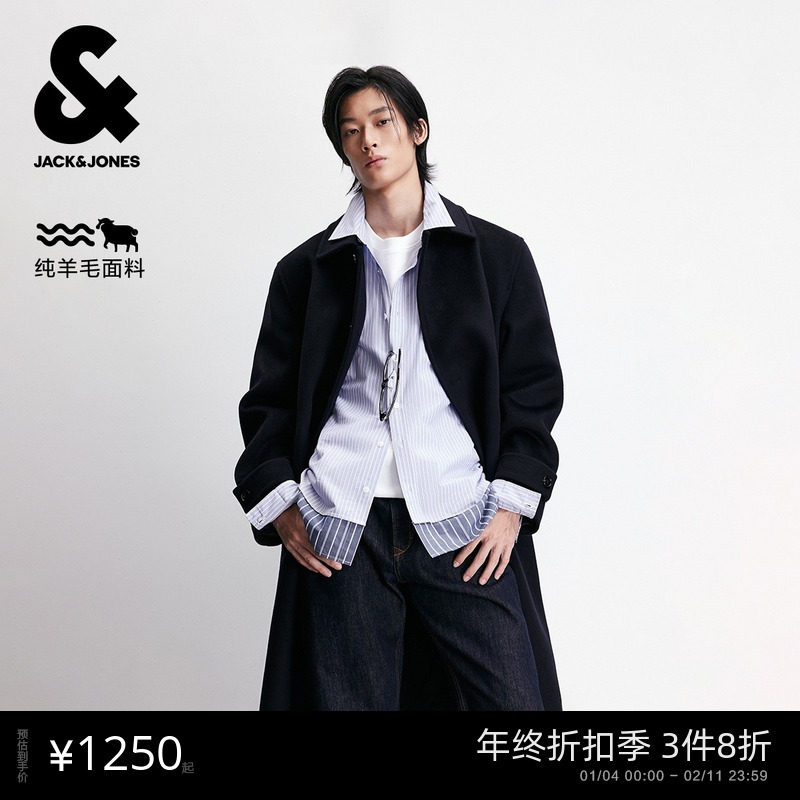 杰克琼斯男装2025年新款毛呢大衣经典纯绵羊毛高智感长款翻领外套