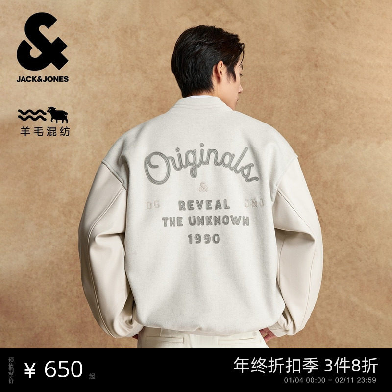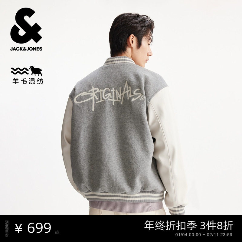 杰克琼斯25年秋季新款百搭夹克仿毛呢PU拼接外套宽松棒球服男装