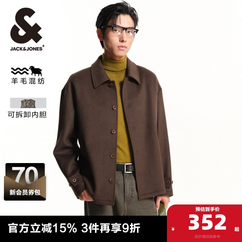 杰克琼斯男装秋冬季毛呢大衣短款保暖外套宽松休闲百搭舒适上衣款