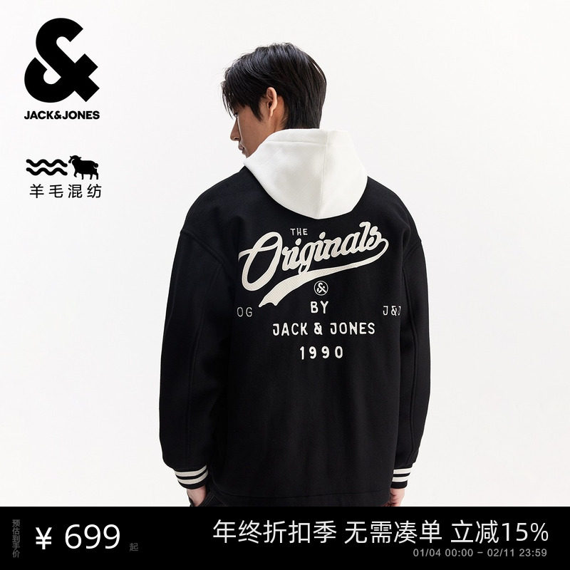 杰克琼斯男装秋冬季毛呢大衣夹克外套宽松时尚棒球服百搭潮流字母