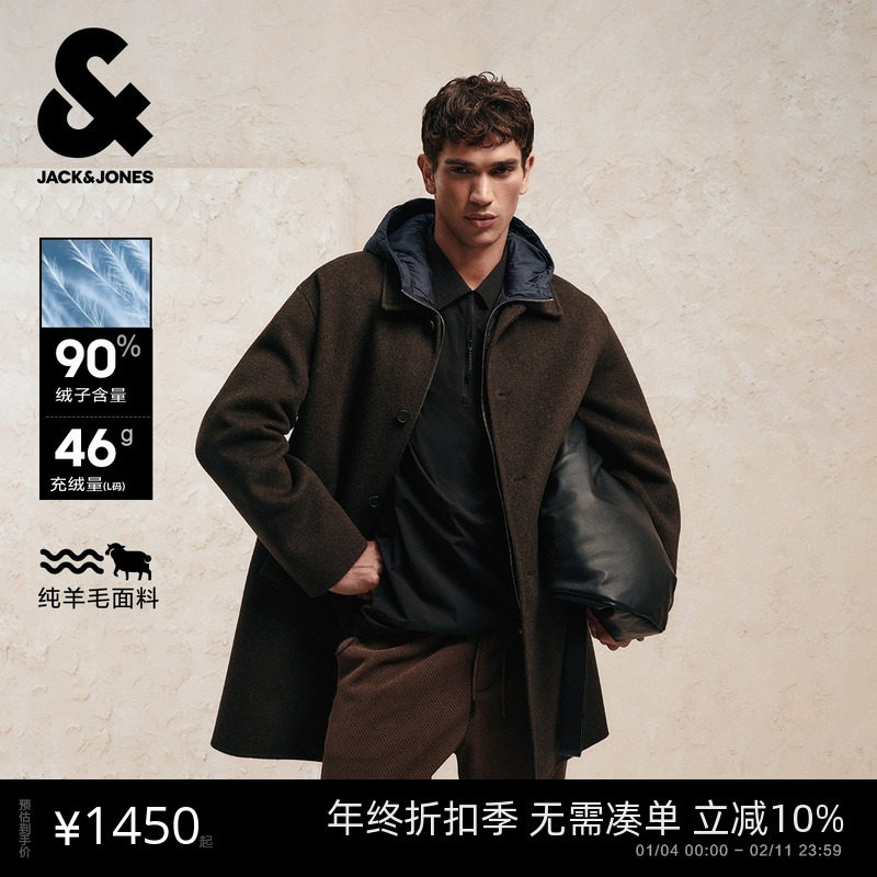 jq区绫致杰克琼斯冬季时尚百搭可拆卸加绒内胆多色尖领毛呢大衣男