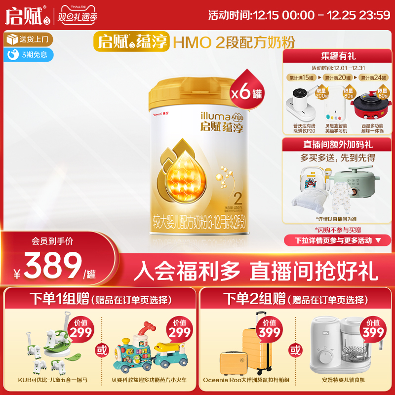 【官方正品】惠氏启赋蕴淳2段HMO进口A2奶源婴儿配方奶粉810g*6罐