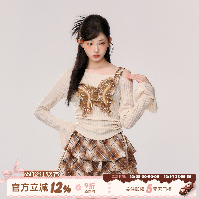 织物猪 豆乳千层 纯欲风蝴蝶露肩长袖上衣套装女秋格纹蛋糕短裙子