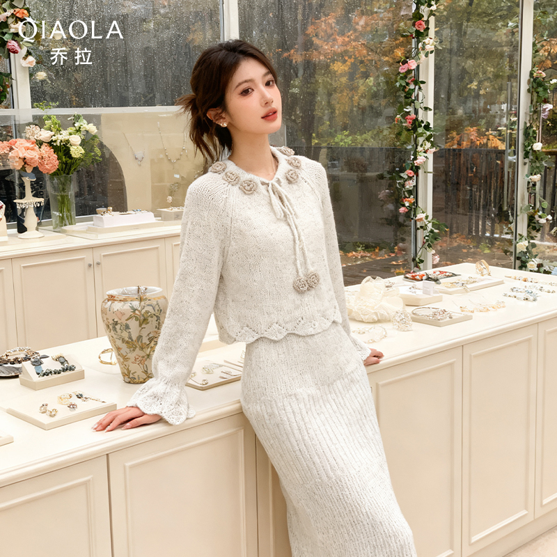 乔拉【豆乳奶酥】秋冬新款法式杏色钩花圆领长袖毛衣半身裙套装女