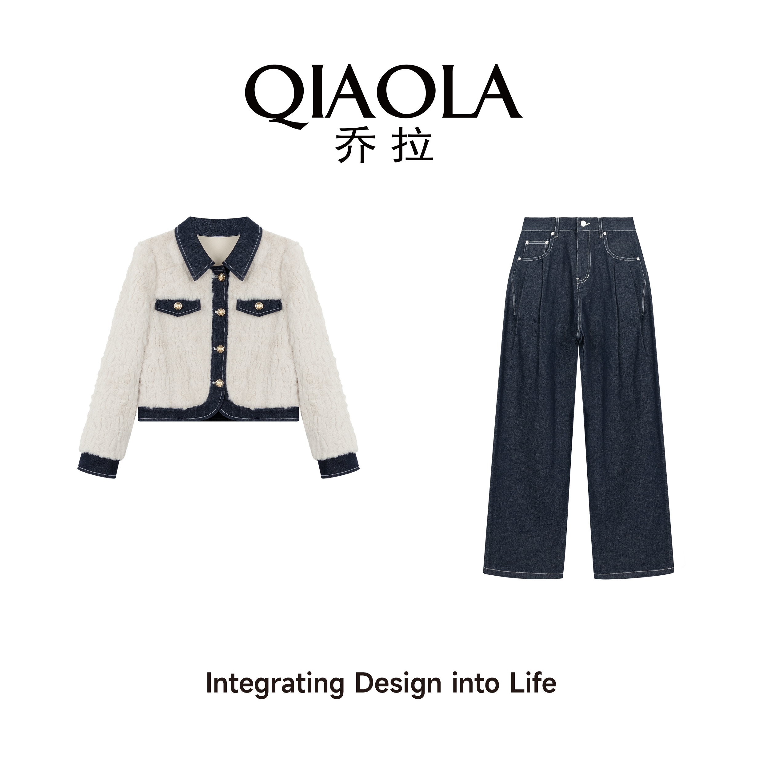 乔拉【豆乳奶冻】冬季新款翻领拼接外套上衣女时尚套装休闲牛仔裤
