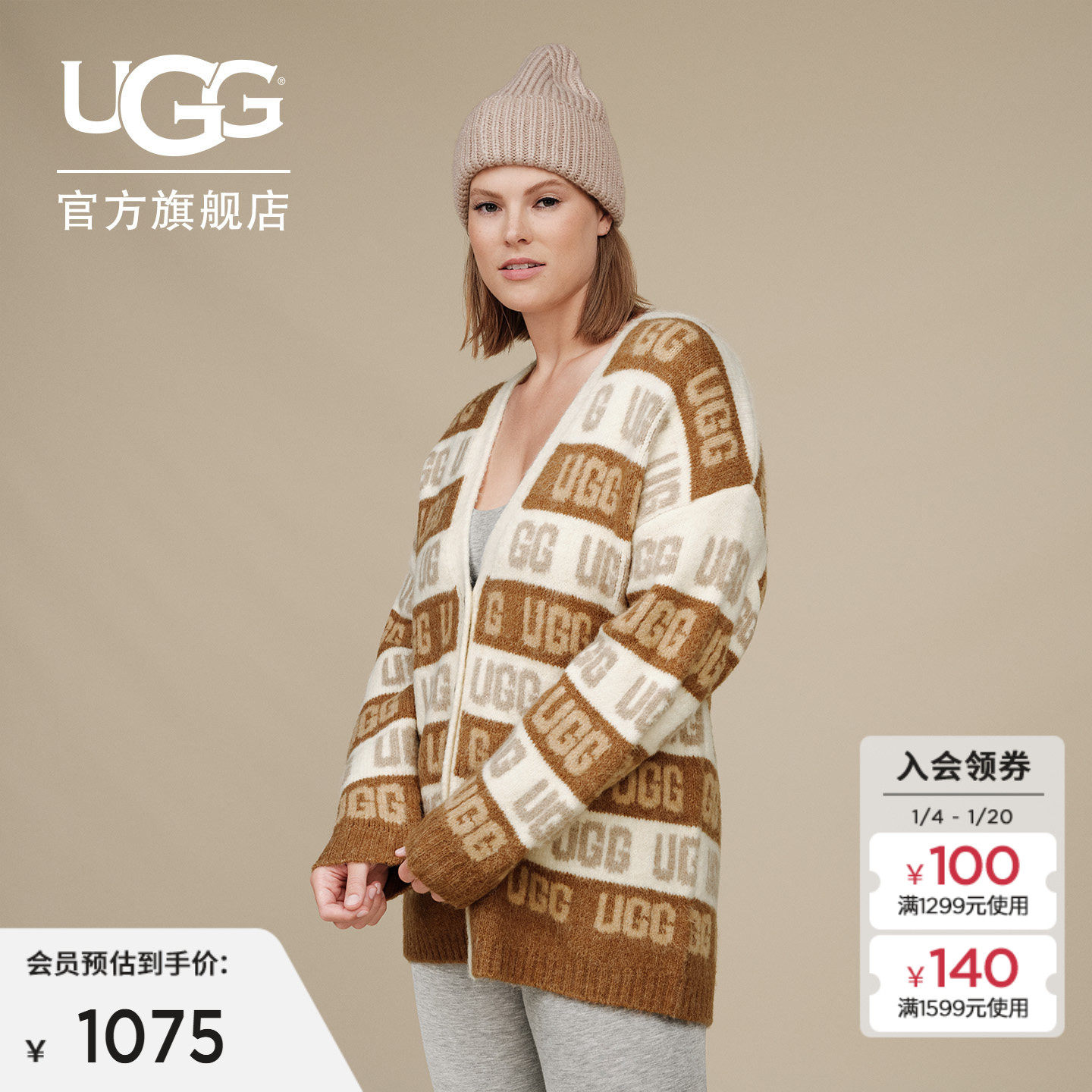 UGG秋季女士舒适纽扣V领LOGO徽标休闲开衫上衣针织衫外套 1149470