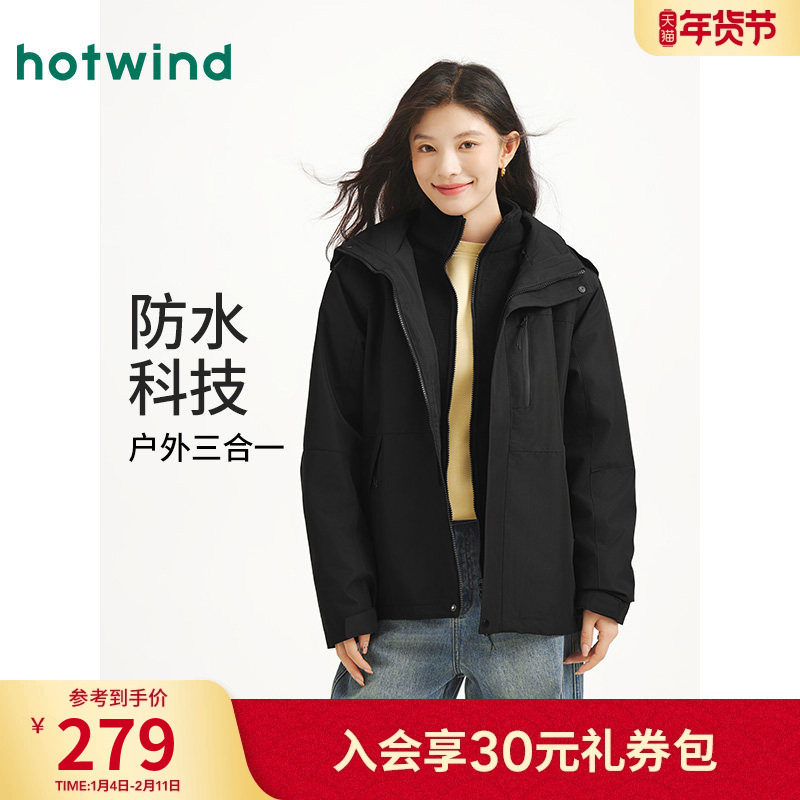 热风女士户外连帽夹克外套2025年秋季新款户外三合一可拆卸外套