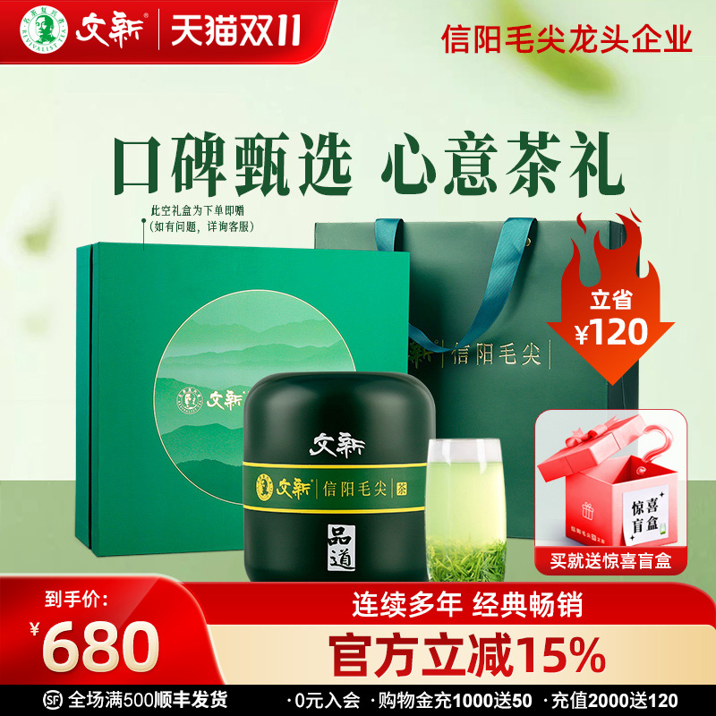 文新信阳毛尖绿茶2025新茶茶叶雨前特级春茶品道60g*4罐送礼盒